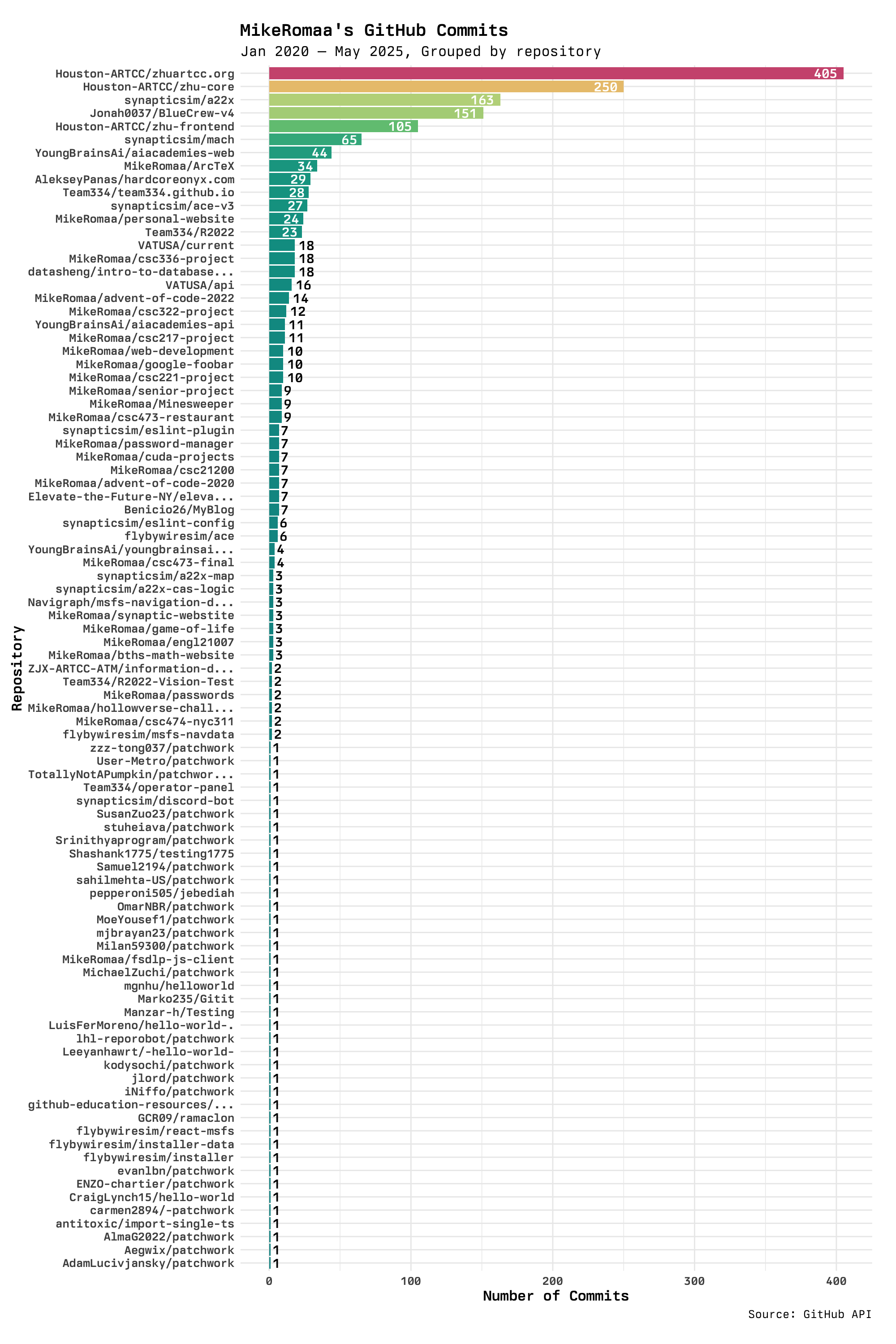 I was actually pretty surprised to see that a much older project of mine had almost double the number of commits than the next repository. But then I realized that my Git hygiene was much worse back when I was starting out, and I would make tons of really small changes in separate commits.