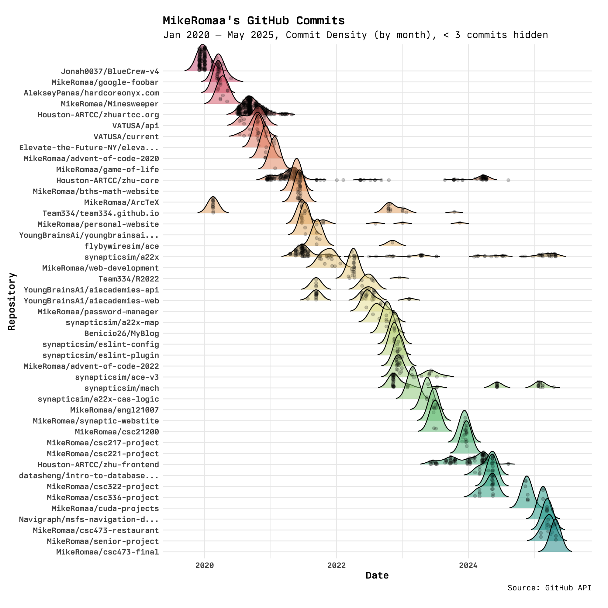 What the previous visualization fails at is showing temporal relationships between the repositories and the number of commits in each. It was hard to tell which repositories were still relevant and not years-old dead projects. To address this, the following visualization plots the density of commits for a month-long period for each repositoriy in a ridgeline plot.
