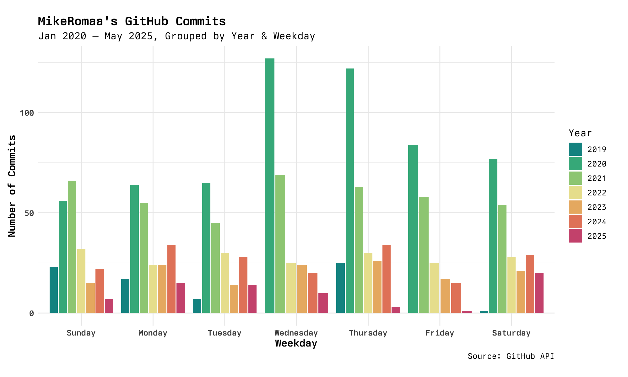 A simple side-by-side bar chart does the trick! In addition to seeing trends across the weekdays, we also get a sense for how many contributions are made in each year, with 2020 and 2021 being clear winners. We see that in 2020, there was a strong preference for working on Wednesdays and Thursdays. This preference gradually died down, however, and by 2022 most days were pretty even in terms of contributions. Fast forwarding to 2025, Fridays seem to be very unpopular for me—strange, I don't even take the day off!